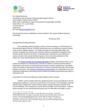 The Global Campaign for Equal Nationality Rights and Institute on Statelessness and Inclusion provided the CEDAW Committee with this submission on the links between gender discrimination in nationality laws, statelessness and human trafficking to inform the Committee’s drafting of a new General Recommendation on trafficking in women and girls in the context of global migration.